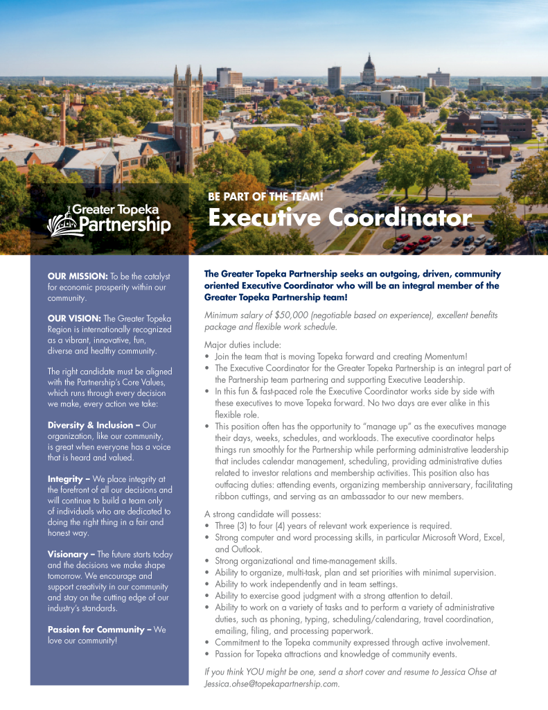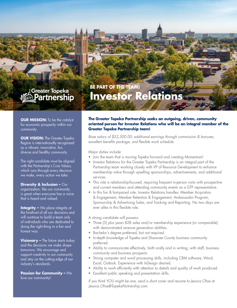 Our Vision: The Greater Topeka Region is internationally recognized as a vibrant, innovative, fun, diverse and healthy community.