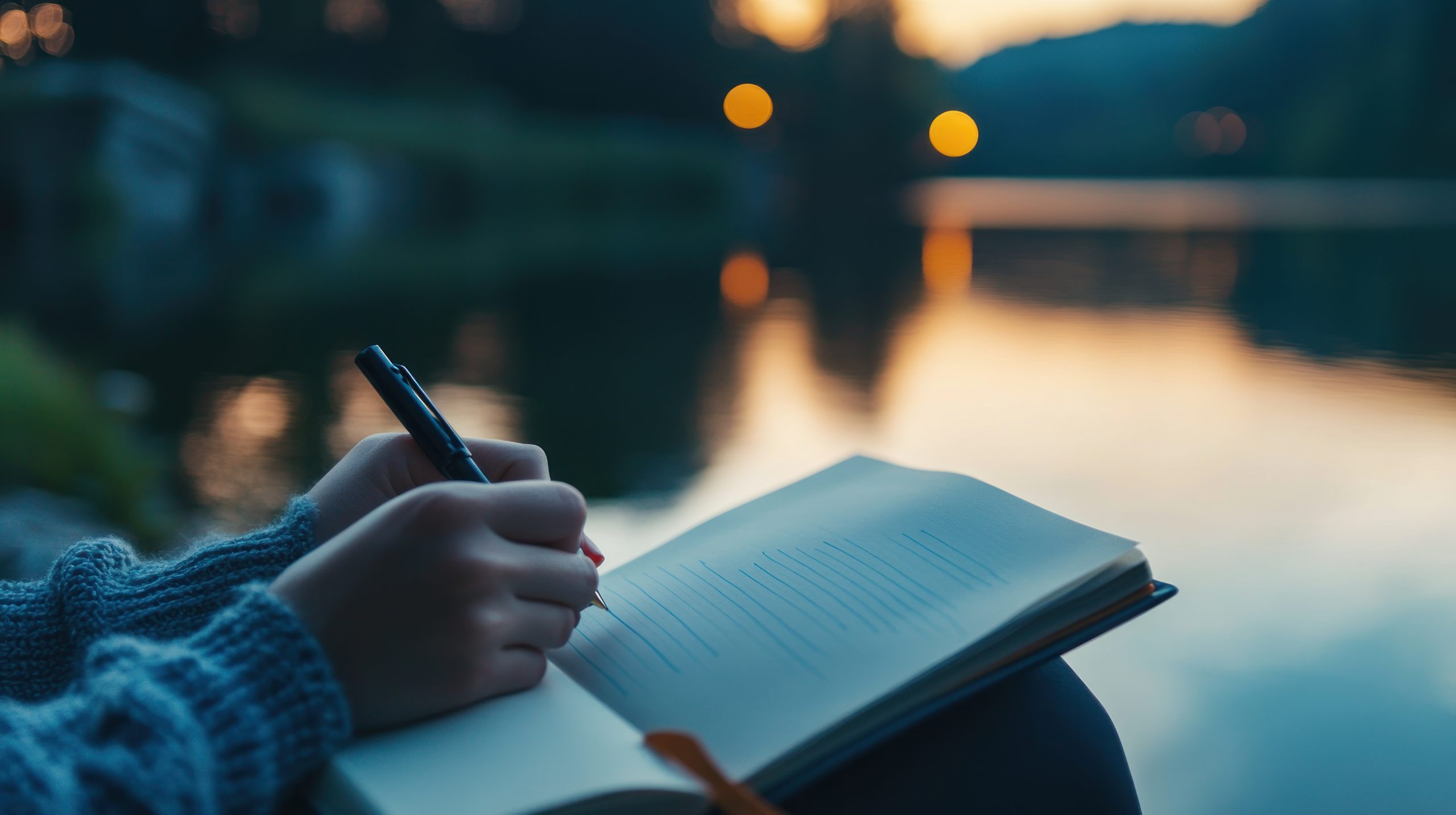 Close up of woman writing with pen in notebook on river bank at sunset.